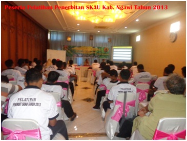 Dinas Kehutanandan Perkebunan Kabupaten Ngawi pada tanggal 17 Oktober s/d 25Oktober 2013 (selama 9 hari) mengadakan Pelatihan Pengembangan, Pengujian, dan Pengendalian Peredaran Hasil Hutan(Sertifikasi PejabatPenerbit SKAU) yang diselenggarakan di Hotel Sukowati Ngawi, dimana pesertanya sebanyak 90 orang dari 90 Desa yang tersebar di 10 Kecamatan dalam wilayah Kabupaten Ngawi.